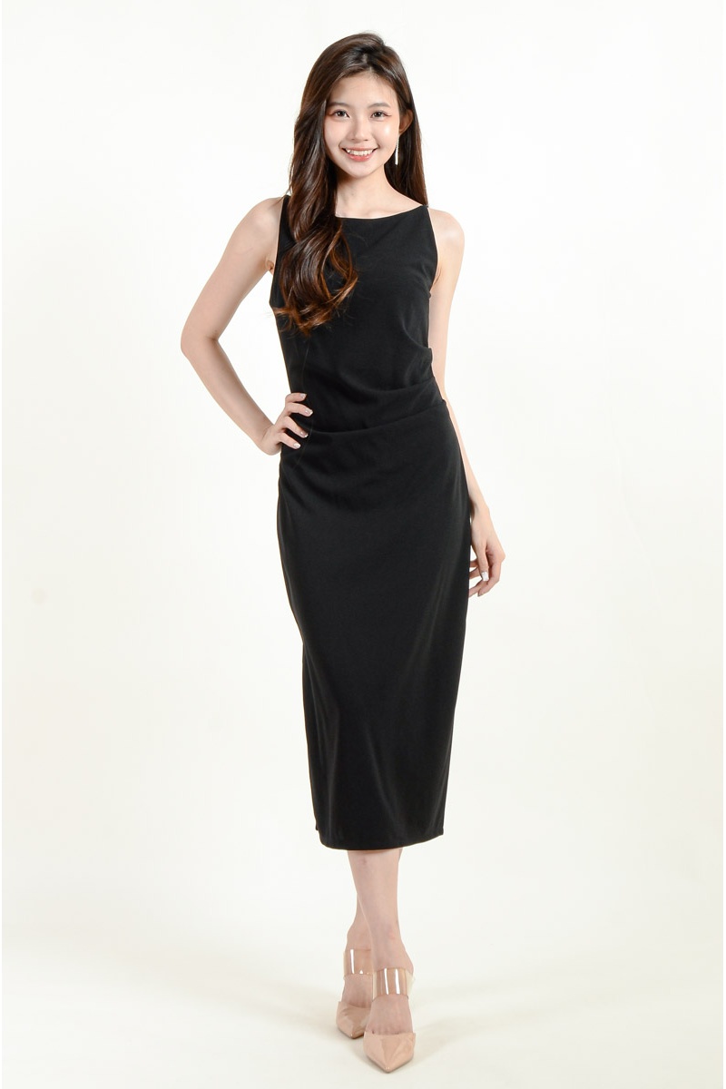 [BackOrder ETA 30 Apr] Zahra Side Slit Ruched Dress - Black
