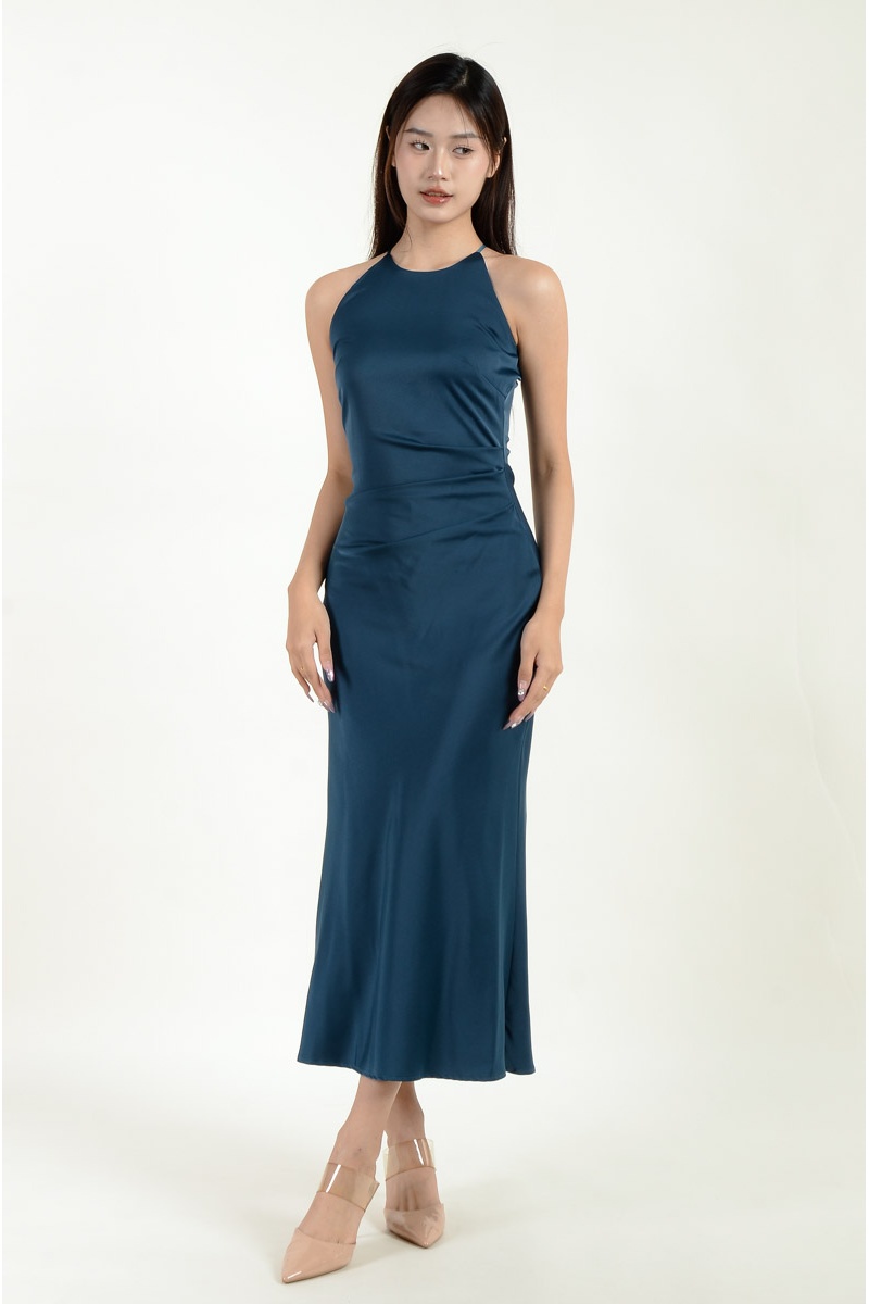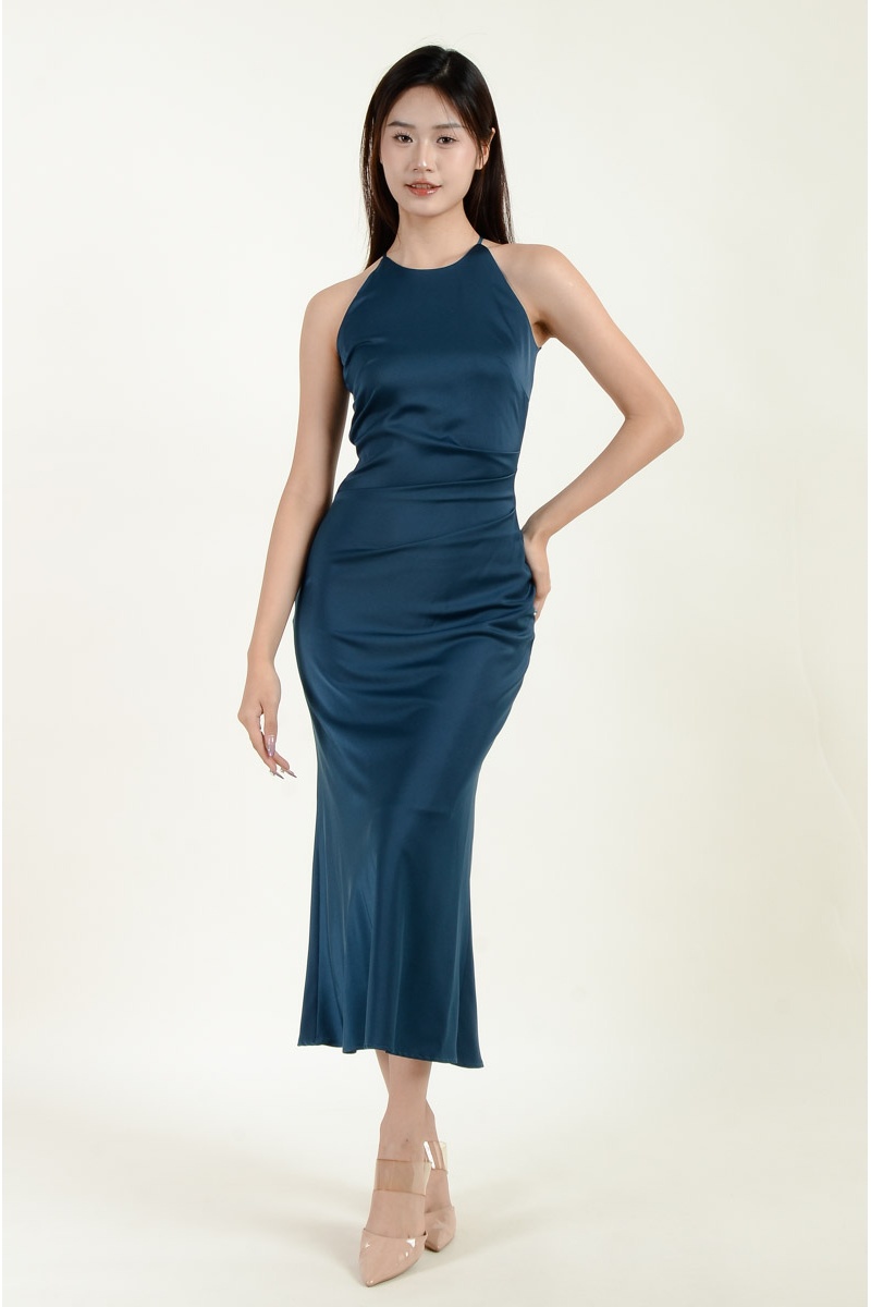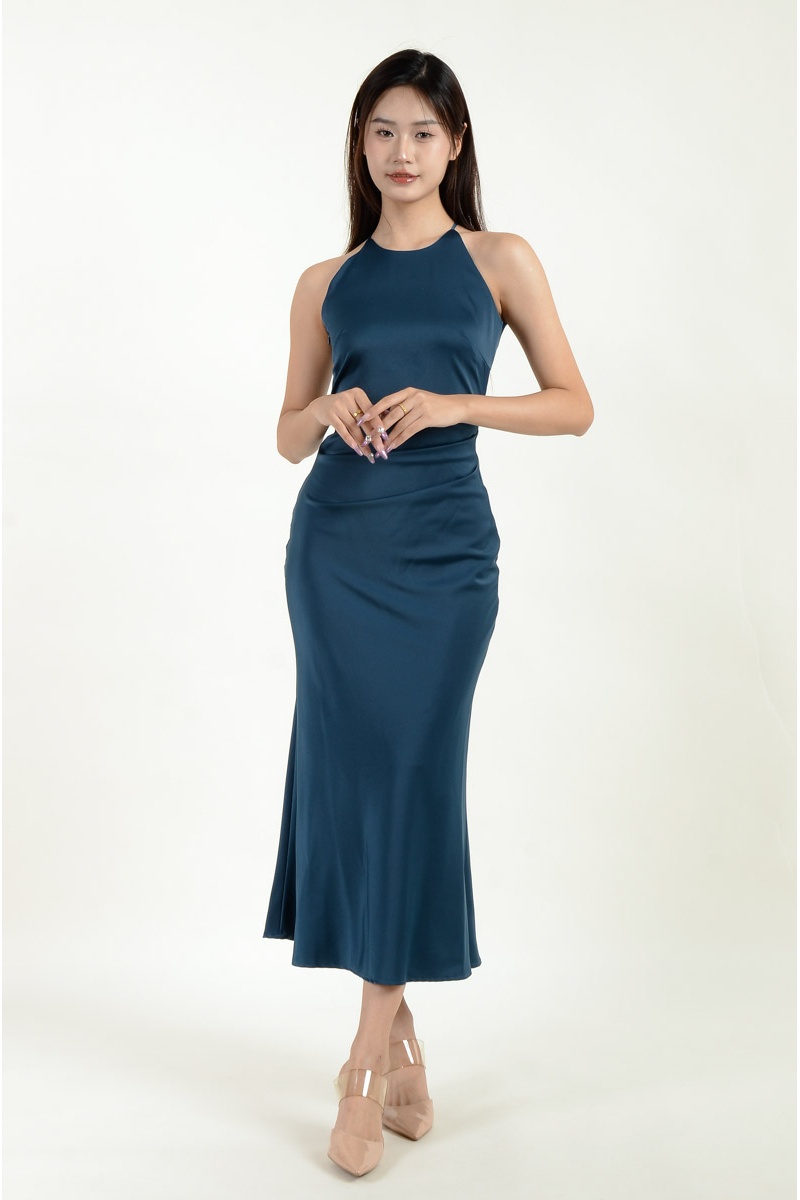Mina Halter Satin Mermaid Dress - Cyan