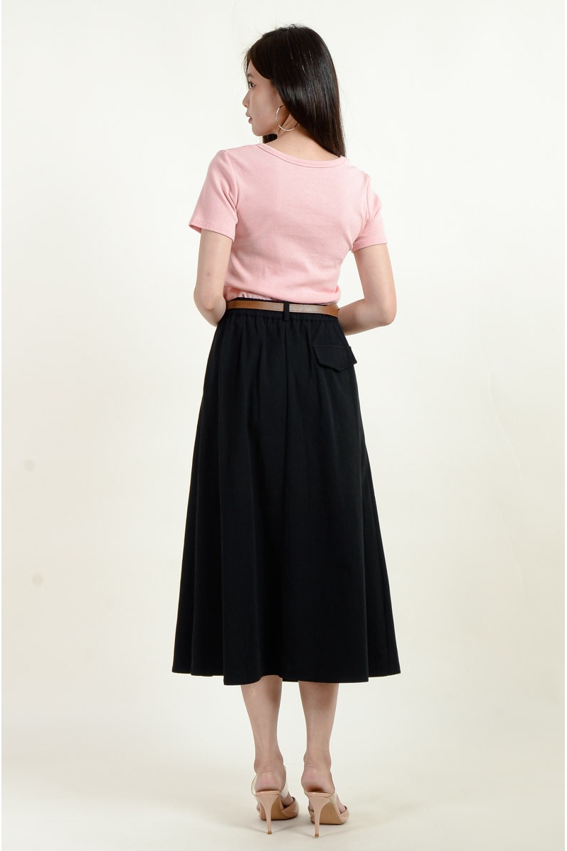 Reyna Belted Skater Midi Skirt - Black